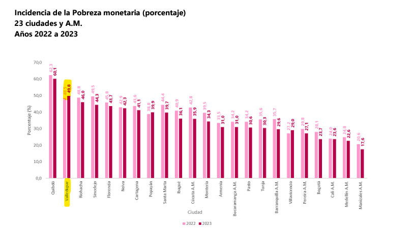 Si se aterriza por ciudad, lastimosamente, Valledupar fue la segunda con mayor porcentaje de pobreza monetaria del país, solo superada por Quibdó (60,1%). La mitad de los vallenatos (49,8%) reciben menos de $448.300 al mes, lo necesario para comprar y acceder a servicios básicos como vivienda, alimentación, aseo, entre otros. Contrario a la tendencia del país, en la capital mundial del vallenato aumentó la pobreza monetaria respecto al 2022 por el drástico incremento del costo de vida (inflación).