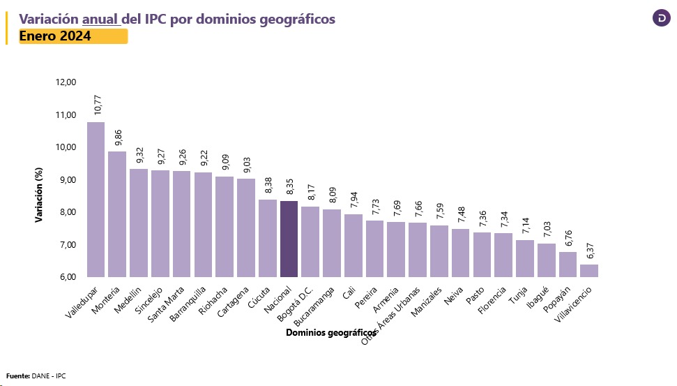 Leonardo Trujillo Oyola, subdirector del DANE, explicó que estos datos corresponden al acumulado desde febrero de 2023 hasta enero de 2024. Tan solo en el mes de enero de 2024, la inflación en Valledupar fue de 1,4 %, el segundo porcentaje más alto del país.