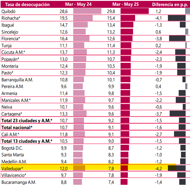 El Departamento Administrativo Nacional de Estadística (DANE) informó este viernes que la tasa de desocupación en Valledupar para el mes de mayo fue de 7,8 %, revelando una reducción de más de cuatro puntos porcentuales frente a la misma fecha del 2024, cuando el desempleo era del 12 %. Con este porcentaje, la capital cesarense logró estar por debajo del promedio nacional que fue del 9 %, ubicándose además como la tercera ciudad con menor tasa de desocupados, la misma de Villavicencio, mientras que el nivel más bajo lo registró Bucaramanga (7,4 %).