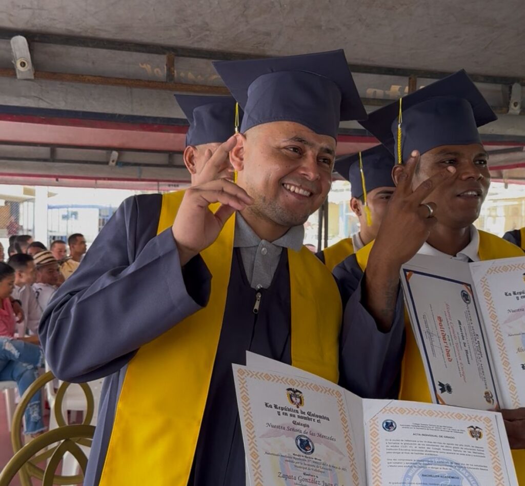 Uno de ellos es Juan Carlos Zapata González, de 33 años, oriundo de Pueblo Bello, Cesar, quien no pudo contener la emoción al recibir el diploma. “Me siento muy contento por haber logrado un objetivo más en mi vida. A pesar de las circunstancias en que nos encontramos, seguimos luchando y metiéndole ganas para seguir adelante”, expresó con una sonrisa que contrastaba con la dureza del entorno.