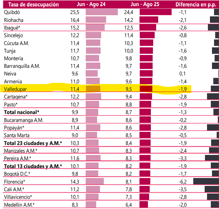 La dinámica del mercado laboral en Valledupar muestra señales mixtas al cerrar agosto de 2025 con una tasa de desempleo del 9,5 %, una reducción notable de 1,9 puntos porcentuales frente al mismo período del 2024, que según el DANE representa una mejora significativa en la generación de empleo en una ciudad que históricamente ha enfrentado retos en este aspecto.