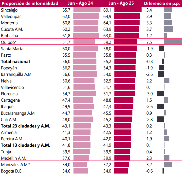 No obstante, esta mejora esconde una realidad compleja: Valledupar mantiene una tasa de informalidad laboral del 64,9 % en agosto de 2025, superior al promedio nacional (55,7 %) y por encima de otras ciudades intermedias y capitales del país, ocupando el preocupante segundo puesto, solo después de Sincelejo (69,1 %).