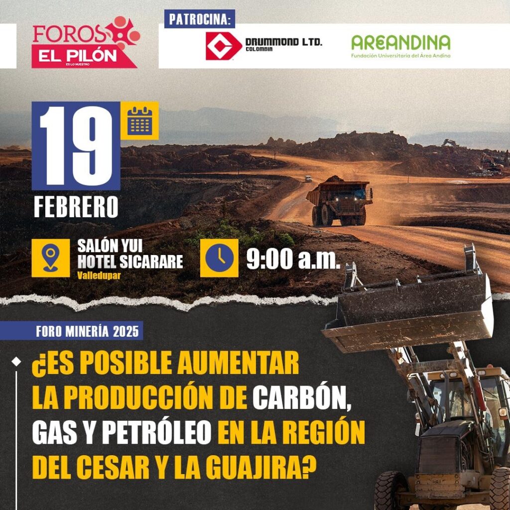 ¿Es posible aumentar la producción de carbón, gas y petróleo en Cesar y La Guajira? Esa es la gran pregunta que diferentes expertos del sector responderán el próximo 19 de febrero, en el salón Yui del Hotel Sicarare en Valledupar, lugar en el que se desarrollará el primer foro sobre minería del 2025 organizado por el diario EL PILÓN.