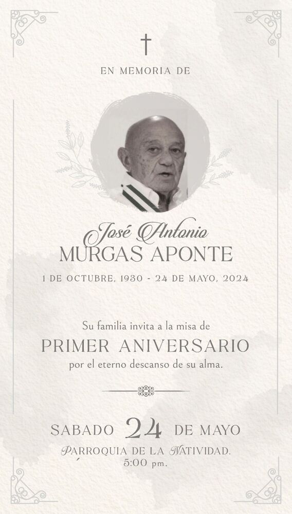 José Antonio Murgas Aponte nació el 1.º de octubre de 1930 y falleció el 24 de mayo de 2024, su legado como autor de la Ley 25 de 1967 y su incansable labor política para el desarrollo del Cesar lo convirtieron en una figura reconocida por la institucionalidad y la sociedad cesarense. Por el primer aniversario de su fallecimiento, su familia realizará una misa por el eterno descanso de su alma, este sábado 24 de mayo a las 5 p.m. en la parroquia de la Natividad, en Valledupar.