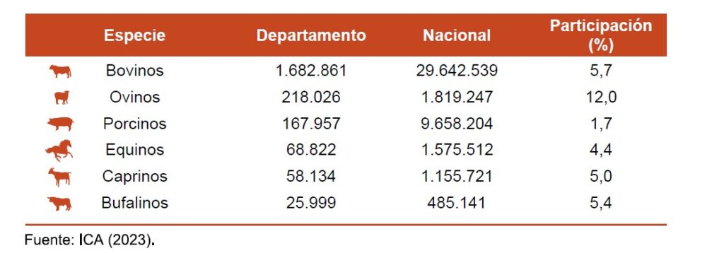 Los equinos y porcinos tienen una participación del 4.4 % y 1.7 %, respectivamente. Este inventario refleja la diversidad y la importancia de la ganadería en la economía regional.