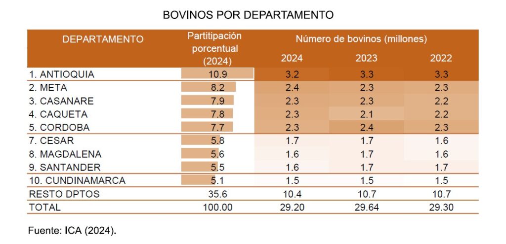 Antioquia lidera con el mayor porcentaje de bovinos, representando el 10.9 % del total en 2024, equivalente a 3.2 millones de bovinos. Meta y Casanare siguen con un 8.2 % y 7.9 %, respectivamente, cada uno con aproximadamente 2.4 y 2.3 millones de bovinos.