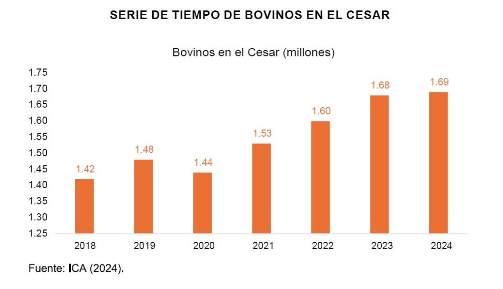 El departamento del Cesar ocupa el séptimo lugar, con un 5.8 % del total nacional en 2024, lo que equivale a 1.7 millones de bovinos. Esta cifra se mantiene constante desde 2023 y muestra un ligero incremento respecto a los 1.6 millones de 2022, reflejando una estabilización y ligero crecimiento en la ganadería de la región.