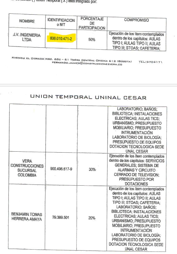 Esas prórrogas representaron millonarias adiciones. El contrato inició costando $38.388 millones, sin embargo tuvo dos adiciones por la suma de $18.118 millones. El Consorcio Uninal estaba conformado por JV Ingeniería LTDA (50 %), Vera Construcciones Sucursal Colombia (30 %) y Benjamín Tomás Herrera (20 %). Su representante legal era Javier Bernardo Varela de Ávila.