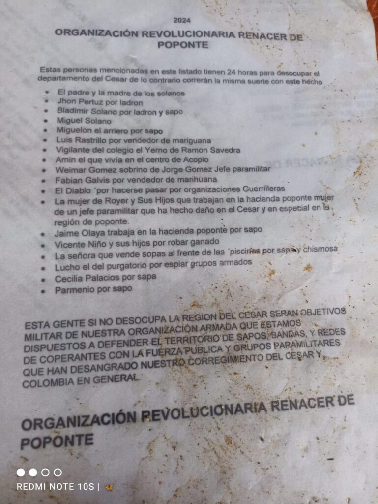 En dicho documento aparecen varios nombres acompañados de adjetivos como “ladrón” y “sapo”. “Esta gente sino desocupa la región del Cesar serán objetivo militar de nuestra organización armada que estamos dispuestos a defender el territorio de sapos, bandas y redes de cooperantes de la fuerza pública y grupos paramilitares que han desangrado nuestro corregimiento del Cesar y Colombia en general”, dice dicho panfleto.