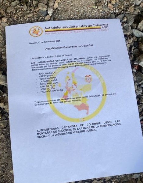“Las Autodefensas Gaitanistas de Colombia, somos una organización política militar de carácter social defensoras de la población civil indefensa y abandonada por los gobiernos corruptos que manejan nuestro país por lo que hoy declaramos objetivos militares a las siguientes personas del municipio de Becerril: Raúl Machado, Fredy Luna, Yenis Machado, Olga Machado, Deysi Machado, Carlos Ríos, José Mojica, Facundo Rincones. Todas estas personas son declaradas no gratas dentro del municipio de Becerril, por tal motivo tiene 24 horas para salir del municipio”, se lee en el comunicado de las Autodefensas Gaitanistas de Colombia.