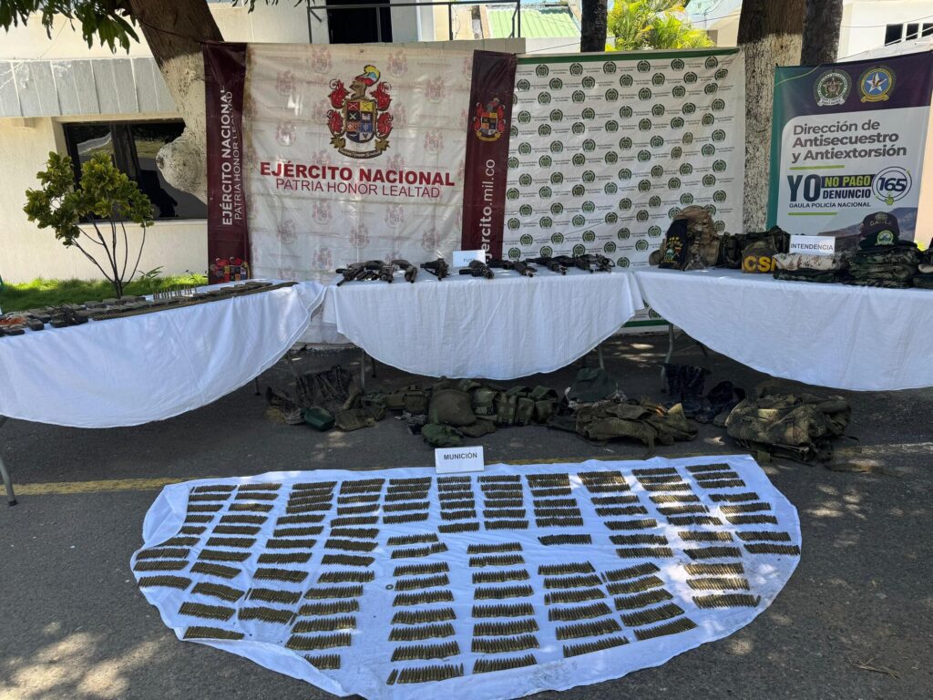 “Una vez recibida la denuncia, se realizó el análisis y se desplegaron grupos especiales hasta la vereda El Mamón, confirmando la información. Allí se encontraron los fusiles, las escopetas y el material de intendencia que pretendían usar para controlar el territorio y fortalecer sus actividades ilícitas”, señaló el oficial.