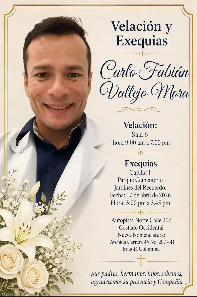 La velación y el funeral de Carlo Vallejo Mora se llevan a cabo en la sala 6 del Parque Cementerio Jardines del Recuerdo, ubicado en la Autopista Norte con Calle 207, en Bogotá. Las exequias están programadas para este viernes 17 de abril en la capilla 1, entre las 3:00 p.m. y las 3:45 p.m.