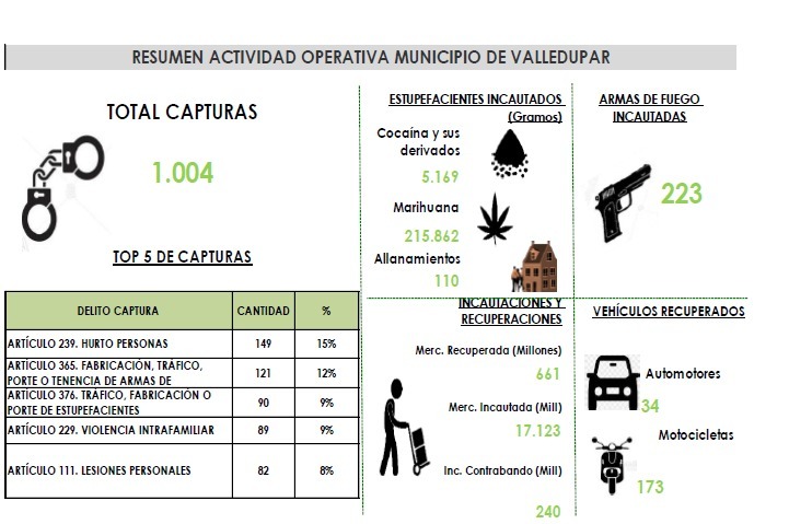 “Con estos resultados, el gobierno local y la Policía Metropolitana reiteran su compromiso de seguir combatiendo la delincuencia y garantizar mayor seguridad para los habitantes de la capital del Cesar”, señaló la Policía Metropolitana.