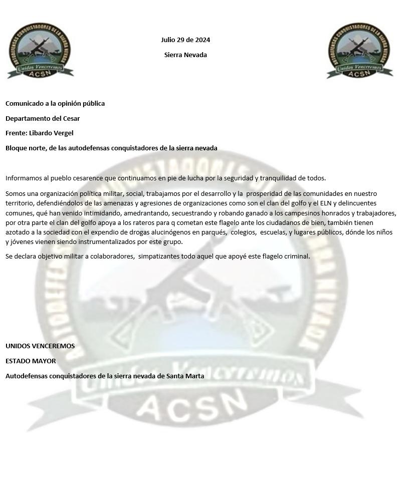 El frente Libardo Vergel, del bloque norte de las Autodefensas Conquistadoras de la Sierra Nevada de Santa Marta, compartió la mañana de este lunes 29 de julio un comunicado a la opinión pública para dar a conocer que “continúan en pie de lucha por la seguridad y tranquilidad de todos”.