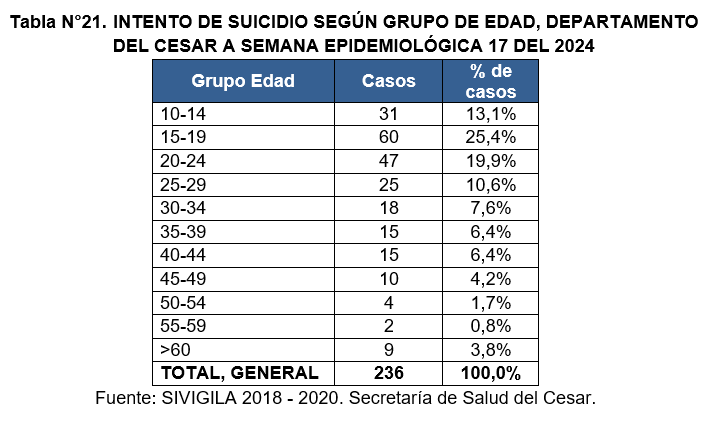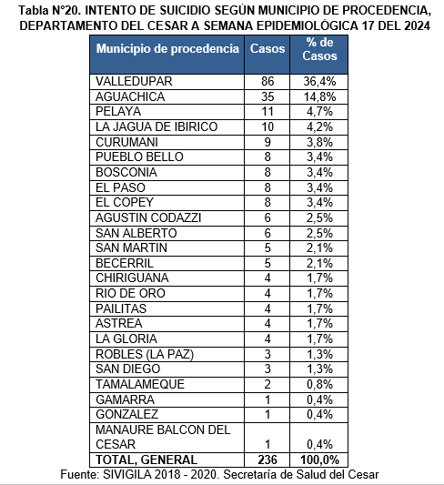 En la semana epidemiológica 17 la Unidad Primaria Generadora de Datos UPGD del Departamento del Cesar notificó que aumentaron 11 casos más de intento de suicidio, siendo el municipio con mayor reporte Valledupar con el 36,4 %, y seguido se ubica Aguachica con el 14,8 %. En el año 2023 a la misma fecha se habían notificado 229 casos de intentos de suicidio representando un aumento del 2,9 %.
