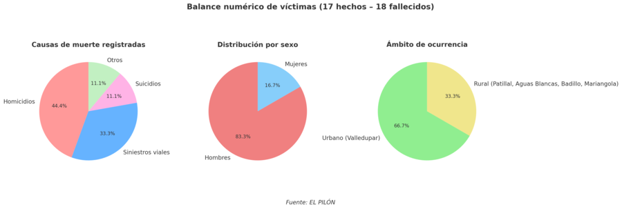 En cuanto al perfil de las víctimas, 15 eran hombres y 3 mujeres, mientras que el ámbito de ocurrencia muestra que la mayoría de los casos (12) se presentaron en la zona urbana de Valledupar, y 6 en zonas rurales como Patillal, Aguas Blancas, Badillo y Mariangola. El rango de edad de los fallecidos oscila entre los 16 y 55 años, aunque en un caso no se reportó la edad.