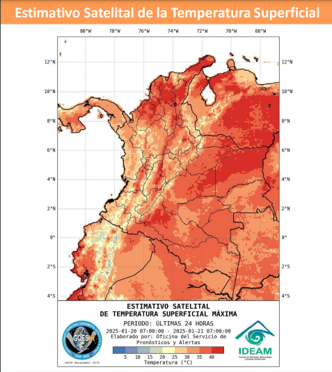 Valledupar es el segundo municipio del país con mayores temperaturas, superado solo por Valparaíso, en Caquetá, que alcanzó los 37.8 °C, mientras que Valledupar llegó a 37.4 °C. Este dato proviene de una estimación realizada por satélites ambientales geoestacionarios en las últimas 24 horas.
