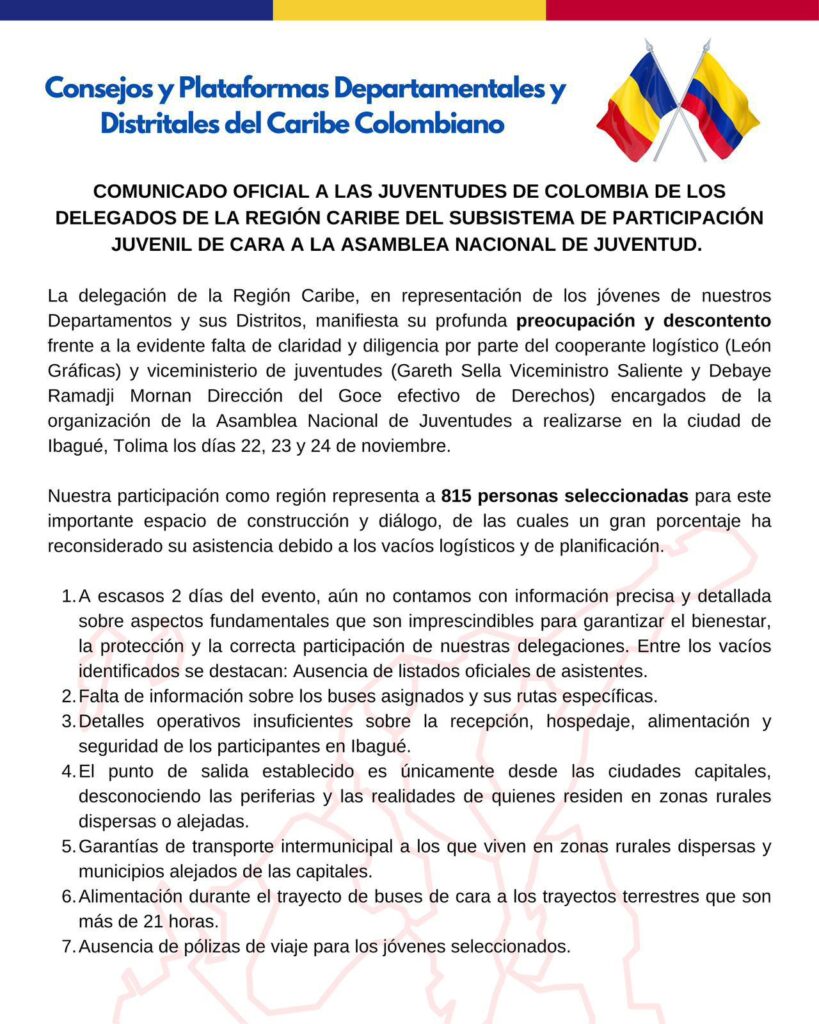 “La delegación de la región Caribe, en representación de los jóvenes de nuestros departamentos y sus distritos, manifiesta su profunda preocupación y descontento frente a la evidente falta de claridad y diligencia por parte del cooperante logístico (León Gráficas) y el viceministerio de Juventudes (Gareth Sella, viceministro saliente) y Debaye Ramadji Mornan, de la Dirección del goce efectivo de derechos), encargados de la organización de la Asamblea”, se lee en el documento.