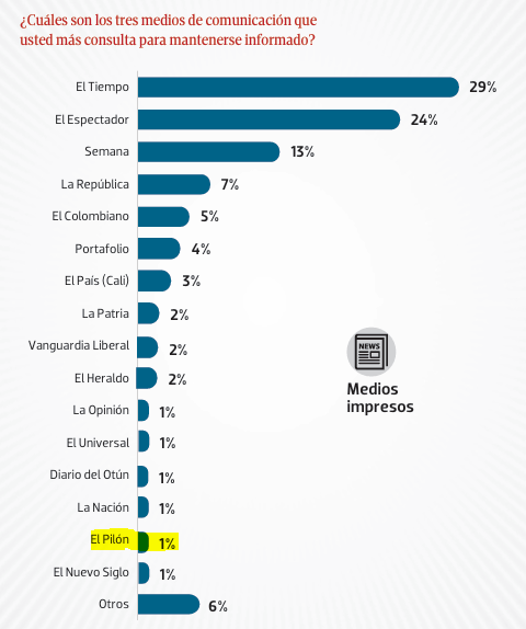 En el listado nacional, El Tiempo lidera con un 29 % de consulta, seguido por El Espectador (24 %) y la revista Semana (13 %), medios con influencia consolidada en las grandes capitales. Contrastando con estas cifras, la presencia de EL PILÓN como medio regional se resalta no solo por su inclusión en un listado mayoritariamente dominado por medios nacionales, sino también por su capacidad de mantener una voz autorizada y confiable en la provincia desde hace 30 años.