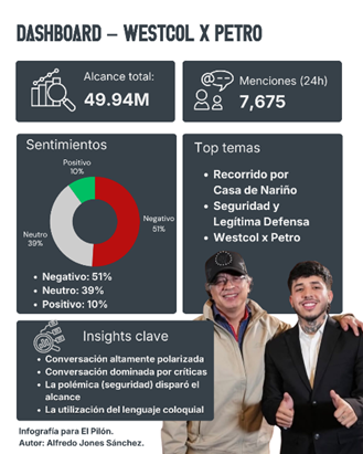 El encuentro entre Westcol y Gustavo Petro generó un impacto masivo en la conversación digital según plataformas de Social Listening, alcanzando cerca de 50 millones de personas y más de 7.600 menciones en 24 horas, lo que evidencia el poder del streaming como canal político. Sin embargo, el análisis de sentimiento muestra un entorno altamente polarizado, con predominio de opiniones negativas (51%), frente a un 39% neutral y solo un 10% positivo. Los temas que más movilizaron la conversación fueron el recorrido por la Casa de Nariño, la discusión sobre seguridad y legítima defensa, y el propio formato Westcol x Petro.