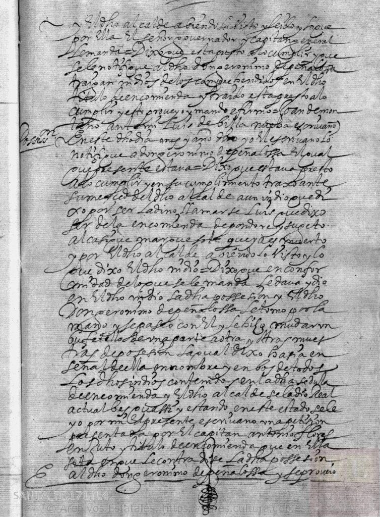dijo que, en conformidad de lo que se le manda, la daba y dio en dicho indio la dicha posesión, y el dicho don Jerónimo le tomó por la mano y le paseó con él y le hizo mudar un bufetillo de una parte a otra en señal de posesión” (AGI, Santa_Fe 171 # 4).