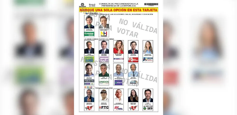 En esta jornada aparecerán tres consultas presidenciales en un único tarjetón, luego de que la Registraduría definiera su orden en un sorteo oficial. Según el sorteo realizado el 7 de febrero de 2026, el tarjetón presentará, en este orden: Consulta de las Soluciones, Gran Consulta por Colombia y Frente por la Vida.