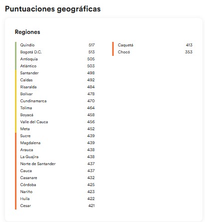 El informe también entrega los resultados por departamentos, y el Cesar lastimosamente se rajó. De los 32 departamentos, el Cesar quedó en el puesto 29 con una calificación de 421 puntos, solo superando a Caquetá y Chocó, y un rendimiento de ‘Muy bajo’.