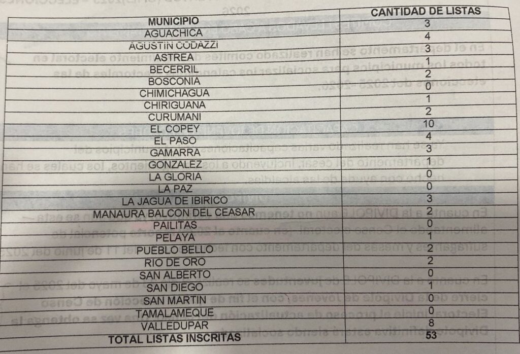La Registraduría Nacional del Estado Civil entregó a EL PILÓN el consolidado oficial de listas independientes inscritas para las elecciones de los Consejos Municipales de Juventud (CMJ) en el departamento del Cesar. Un total de 53 listas fueron inscritas en 18 de los 25 municipios. El territorio con mayor número de listas inscritas fue El Copey, con 10, seguido por Valledupar, que registró 8 listas, y El Paso, con 4, al igual que Agustín Codazzi. Con 3 listas inscritas figuran Gamarra, Aguachica, La Jagua de Ibirico y Astrea.