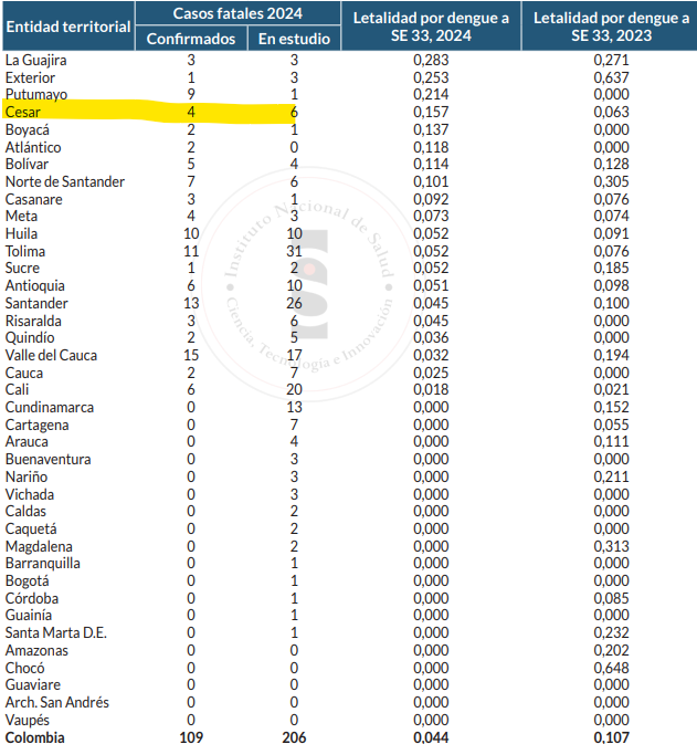 Las personas que fallecieron después del diagnóstico de dengue grave en el Cesar fueron 4, de acuerdo con el documento oficial, el cual indica que hay 6 casos más en estudio. A nivel nacional se reportaron 247.953 infectados para el mencionado periodo.