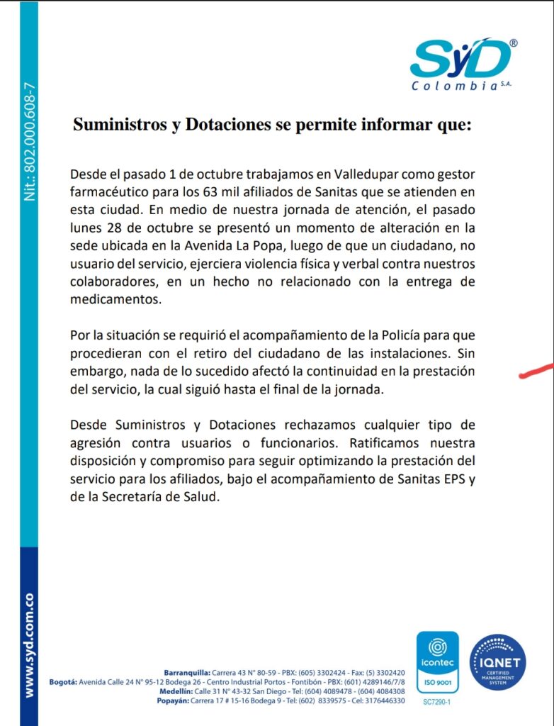 Según un comunicado emitido por SyD Colombia el 29 de octubre: “Desde el pasado 1 de octubre trabajamos en Valledupar como gestor farmacéutico para los 63 mil afiliados de Sanitas que se atienden en esta ciudad. En medio de nuestra jornada de atención, el pasado lunes 28 de octubre se presentó un momento de alteración en la sede ubicada en la Avenida La Popa, luego de que un ciudadano, no usuario del servicio, ejerciera violencia física y verbal contra nuestros colaboradores, en un hecho no relacionado con la entrega de medicamentos”.
