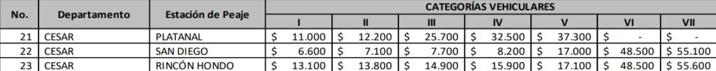 Así las cosas, entre las estaciones que deben aplicar el incremento en el departamento del Cesar está Platanal (ubicado en el sector de Aguaclara y Río de Oro), donde los vehículos de categoría I tienen que pagar $11.000; la categoría II: $12.200; categoría III: $27.500; IV: $32.500 y la categoría V: $37.300.