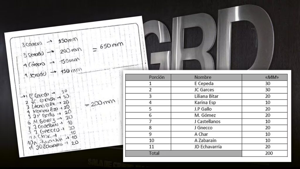 En el manuscrito, en el apartado correspondiente a la Comisión Tercera del Senado, tasado en un total de 200.000 millones de pesos, se lista a once legisladores con cupos asignados. En esa sección se lee el apunte “J Gnecco” asociado a la cifra 20, lo que la Corte Suprema de Justicia interpreta como una presunta asignación de 20.000 millones de pesos.