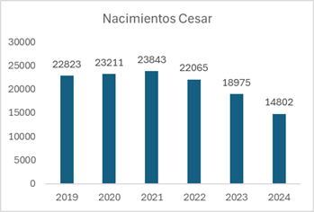 Entre el 2019, año previo a la pandemia y el 2024, la reducción en el número de nacidos es de 197.649. Es decir, por cada 100 bebés nacidos en el 2019, nacieron 70 en el 2024, un 30% menos. En el Cesar por cada 100 nacidos en el 2019, nacieron 65 en el 2024, un 35% menos. En Valledupar la situación es más crítica, nacieron solamente 62, un 38% menos.