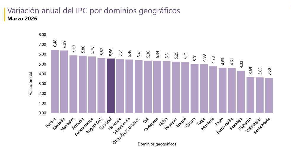 Para el cierre de marzo de 2026, el reporte oficial indicó que la inflación anual en Colombia se ubicó en 5,56%. A nivel nacional, este incremento estuvo impulsado por el aumento en las tarifas de servicios de comunicación y las alzas en los sectores de Restaurantes y hoteles (9,92%), Salud (7,87%) y Educación (7,54%).
