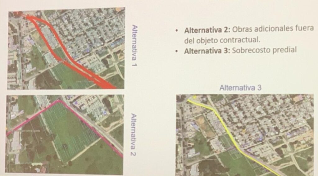 Sobre el acceso al barrio, el director de la obra anotó que para poder intervenir, primero debe existir un convenio entre el municipio, el Instituto Nacional de Vías (Invías) y Findeter, en el que definan el trazado final en ese sector, basado en las 3 propuestas que han sido expuestas por el contratista, y evaluar la posible compra de las viviendas de la carrera 7B con calle 46.