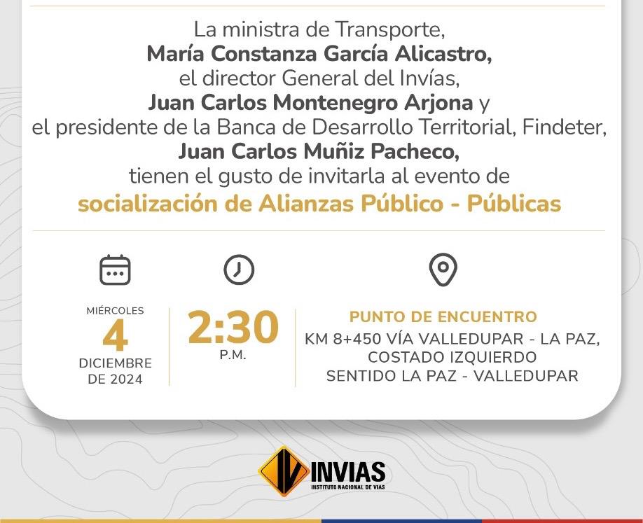 Para este miércoles 4 de diciembre fue anunciada la llegada de la ministra de Transporte, María Constanza García Alicastro, el director General del Instituto Nacional de Vías (Invías), Juan Carlos Montenegro Arjona, y el presidente de la Banca de Desarrollo Territorial (Findeter), Juan Carlos Muñiz Pacheco, a la segunda calzada Valledupar-La Paz, exactamente en el costado izquierdo en sentido La Paz-Valledupar, kilómetro 8+450.