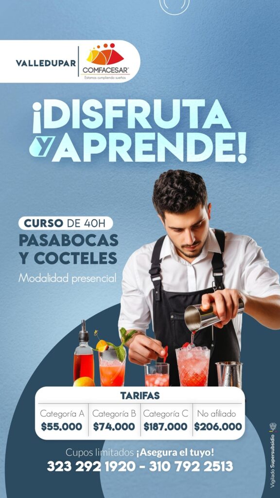 La Caja de Compensación Familiar del Cesar (COMFACESAR) abrió una nueva oportunidad de formación en Valledupar con su curso presencial de pasabocas y cócteles, dirigido a todos aquellos interesados en incursionar en el mundo de la gastronomía y la coctelería.