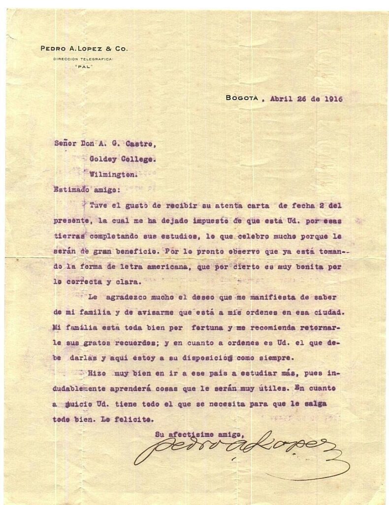 Correspondencia dirigida a Aníbal Guillermo Castro Monsalvo por parte del padre de Alfonso López Pumarejo (Cortesía: familia).