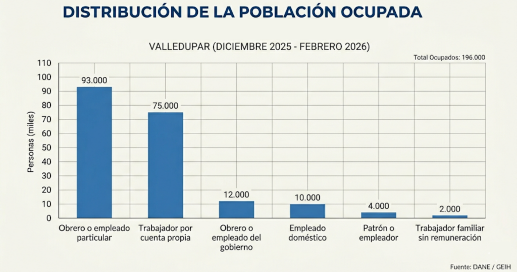 Al revisar la estructura de quiénes generan los ingresos, las cifras muestran una brecha marcada entre la empresa privada, el rebusque y el Estado. El mayor peso de la economía local recae sobre la categoría de obrero o empleado particular, que agrupa a 93.000 trabajadores.