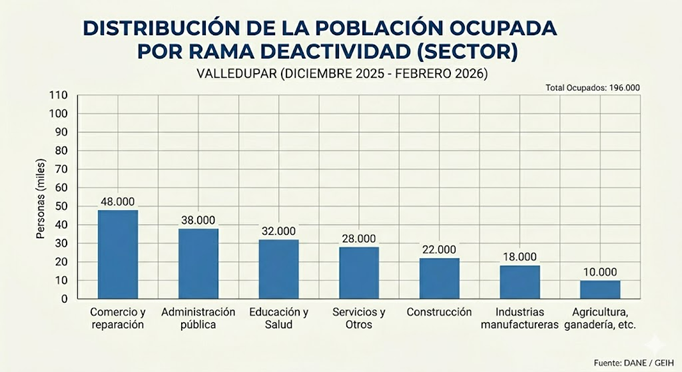 La otra cara de la moneda es el trabajo independiente. Un total de 74.000 vallenatos derivan su sustento como trabajadores por cuenta propia. Este volumen de personas nutre directamente al sector del comercio y la reparación de vehículos, que se consolida como la rama económica más grande con 44.000 ocupados. Aquí se agrupan los vendedores al por menor y los pequeños negocios que movilizan el dinero diario en las calles y locales comerciales.