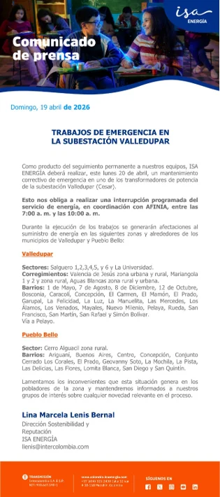 ISA Energía lamentó los inconvenientes que estas labores puedan causar y aseguró que mantendrá informada a la ciudadanía sobre cualquier novedad durante el proceso.