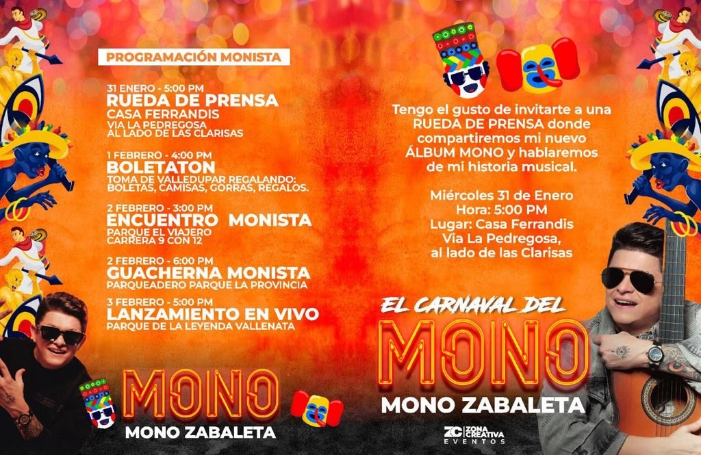 El cantante de música vallenata Mono Zabaleta y su acordeonero Daniel Maestre presentaron ante los medios de comunicación su nuevo álbum ‘Mono’, que será lanzado en vivo este sábado 3 de febrero en el parque de la Leyenda Vallenata de Valledupar.