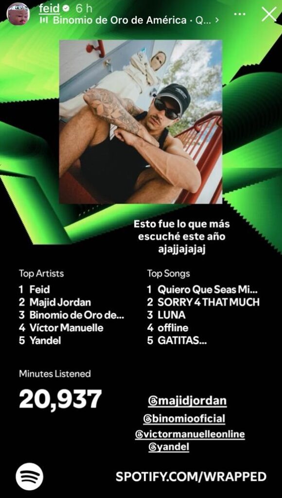 El cantante de música urbana Feid mostró en su cuenta de Instagram su Spotify Wrapped, una opción de la app en la que se muestra el resumen anual de lo más escuchado por los usuarios.