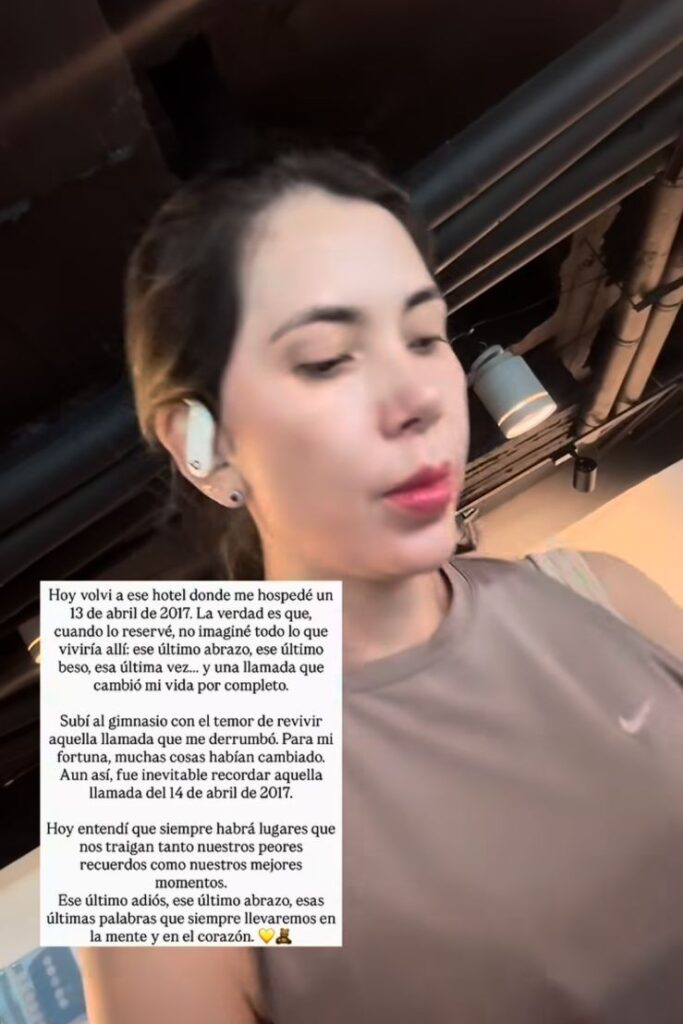 “Hoy volví a ese hotel donde me hospedé un 13 de abril de 2017. La verdad es que, cuando lo reservé, no imaginé todo lo que viviría allí: ese último abrazo, ese último beso, esa última vez… Y una llamada que cambió mi vida por completo”, expresó la comunicadora social.