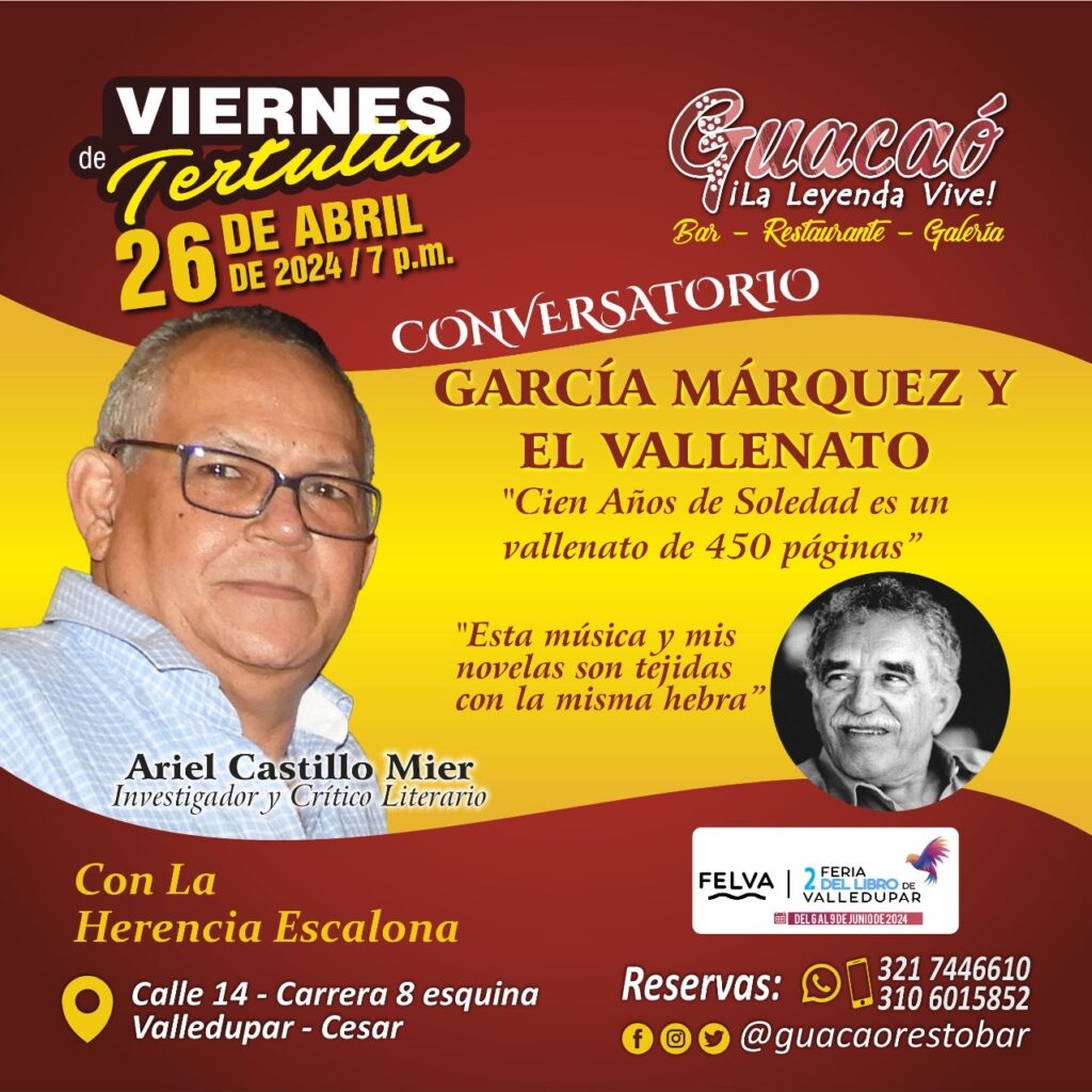 El Restaurante Bar Guacaó será escenario del conversatorio ‘García Márquez y El Vallenato’, que se realizará este viernes 26 de abril, a partir de las 7:00 de la noche.