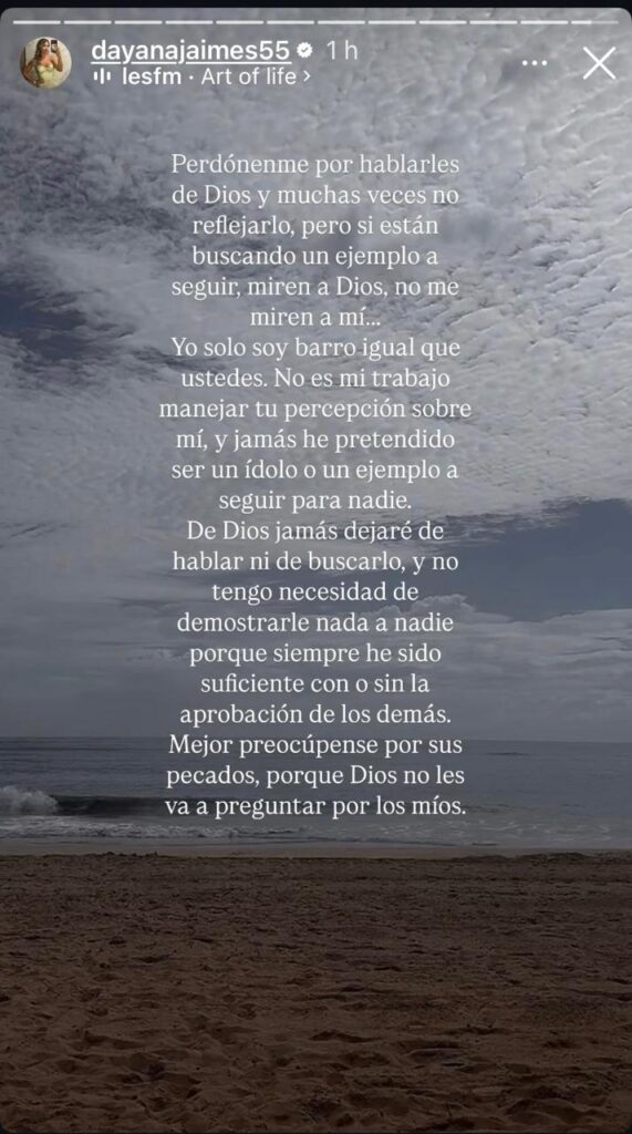 Tras lo ocurrido, este domingo 13 de abril, Dayana compartió a través de sus historias de Instagram una reflexión sobre su fe en Dios, aclarando que nunca ha pretendido “ser un ídolo o un ejemplo a seguir para nadie”.