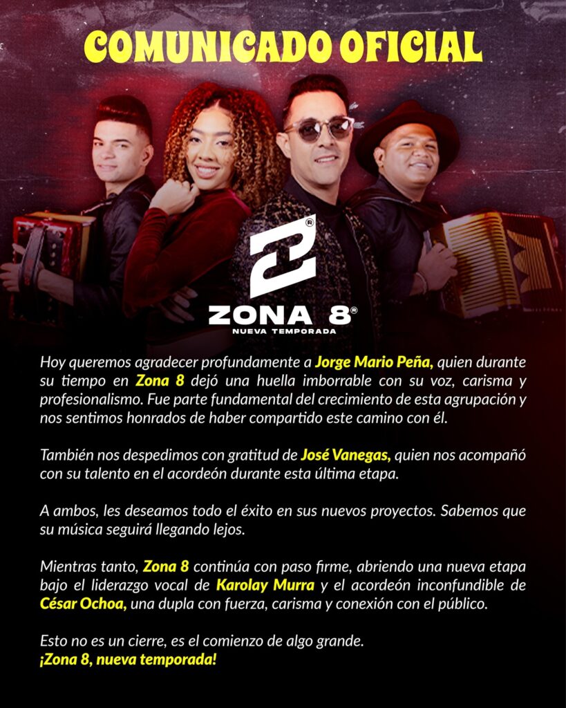 Hoy queremos agradecer profundamente a Jorge Mario Peña, quien durante su tiempo en Zona 8 dejó una huella imborrable con su voz, carisma y profesionalismo. Fue parte fundamental del crecimiento de esta agrupación y nos sentimos honrados de haber compartido este camino con él. También nos despedimos con gratitud de José Vanegas, quien nos acompañó con su talento en el acordeón durante esta última etapa”, se lee en el documento.