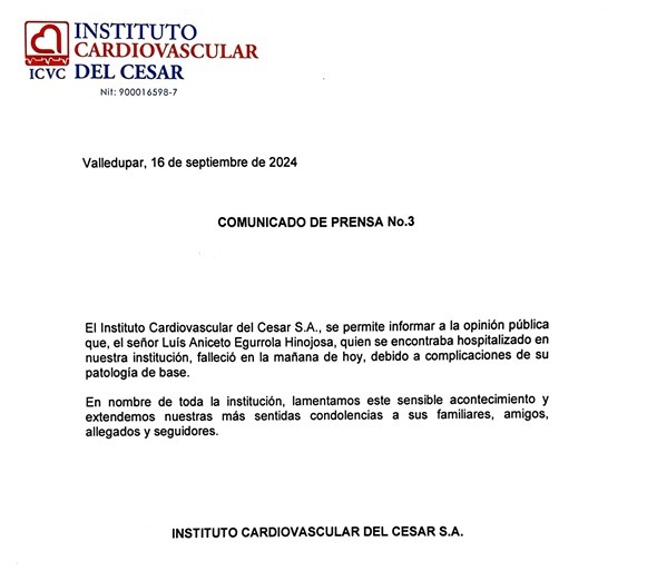 A través de un comunicado de prensa, la institución lamentó el fallecimiento del compositor y envió un mensaje de condolencia a sus familiares. “El Instituto Cardiovascular del Cesar S.A., se permite informar a la opinión pública que, el señor Luis Aniceto Egurrola Hinojosa, quien se encontraba hospitalizado en nuestra institución, falleció en la mañana de hoy, debido a complicaciones de su patología de base”, se lee en el documento.