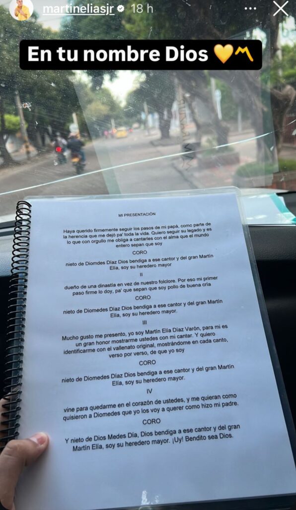 En la canción ‘Mi presentación’, su primer sencillo, Martín Elías Jr. narra lo orgulloso que se siente de seguir el legado de su papá, de ser nieto de Diomedes Díaz y expresa el cariño que siente por sus fans y el respaldo que le han brindado en su carrera que apenas inicia.