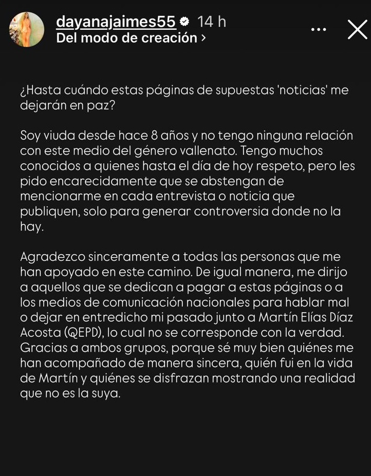 “Soy viuda desde hace 8 años y no tengo ninguna relación con este medio del género vallenato. Tengo muchos conocidos a quienes hasta el día de hoy respeto, pero les pido encarecidamente que se abstengan de mencionarme en cada entrevista o noticia que publiquen, solo para generar controversia donde no la hay”, expresó en un mensaje publicado en sus historias de Instagram.